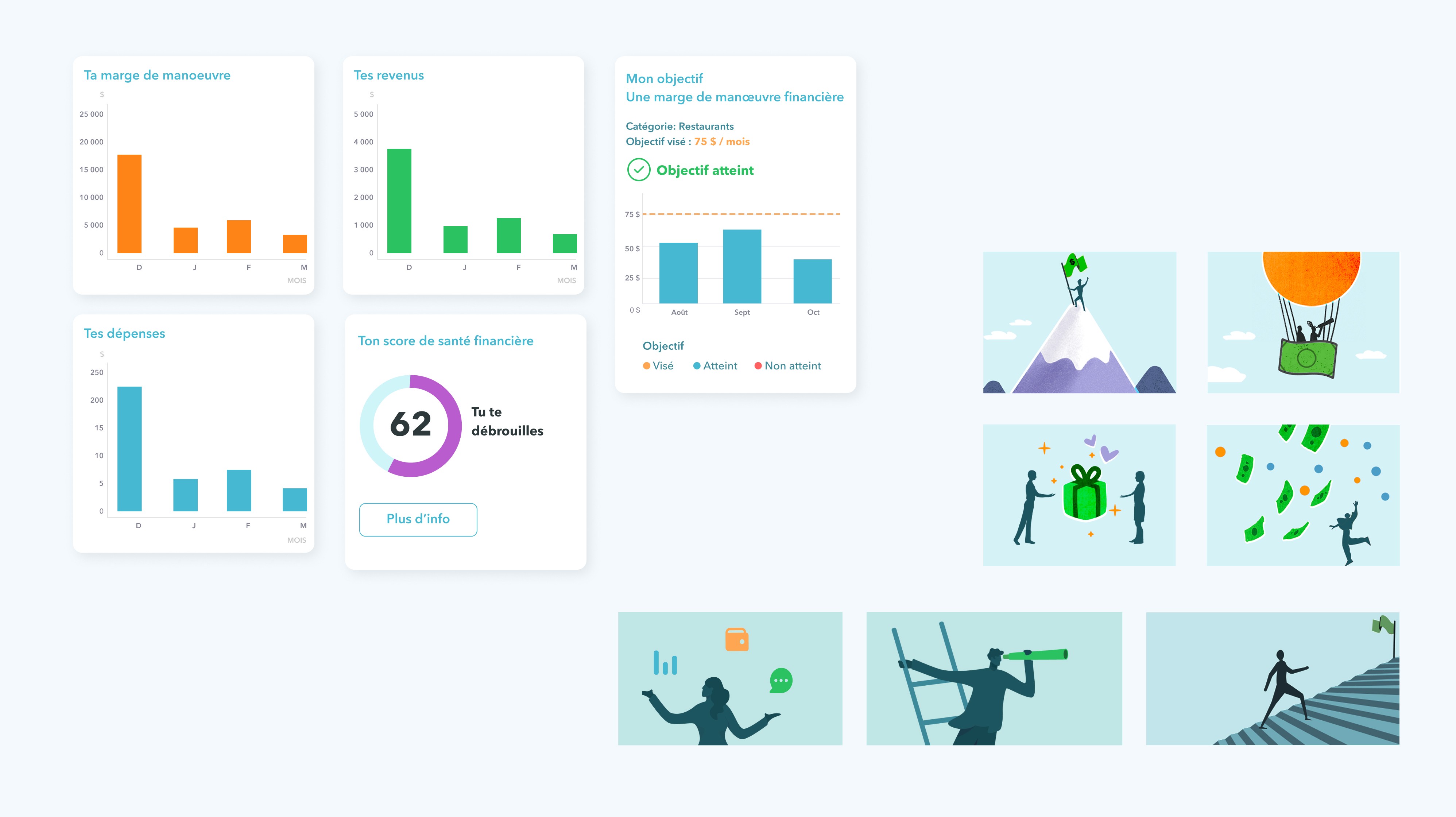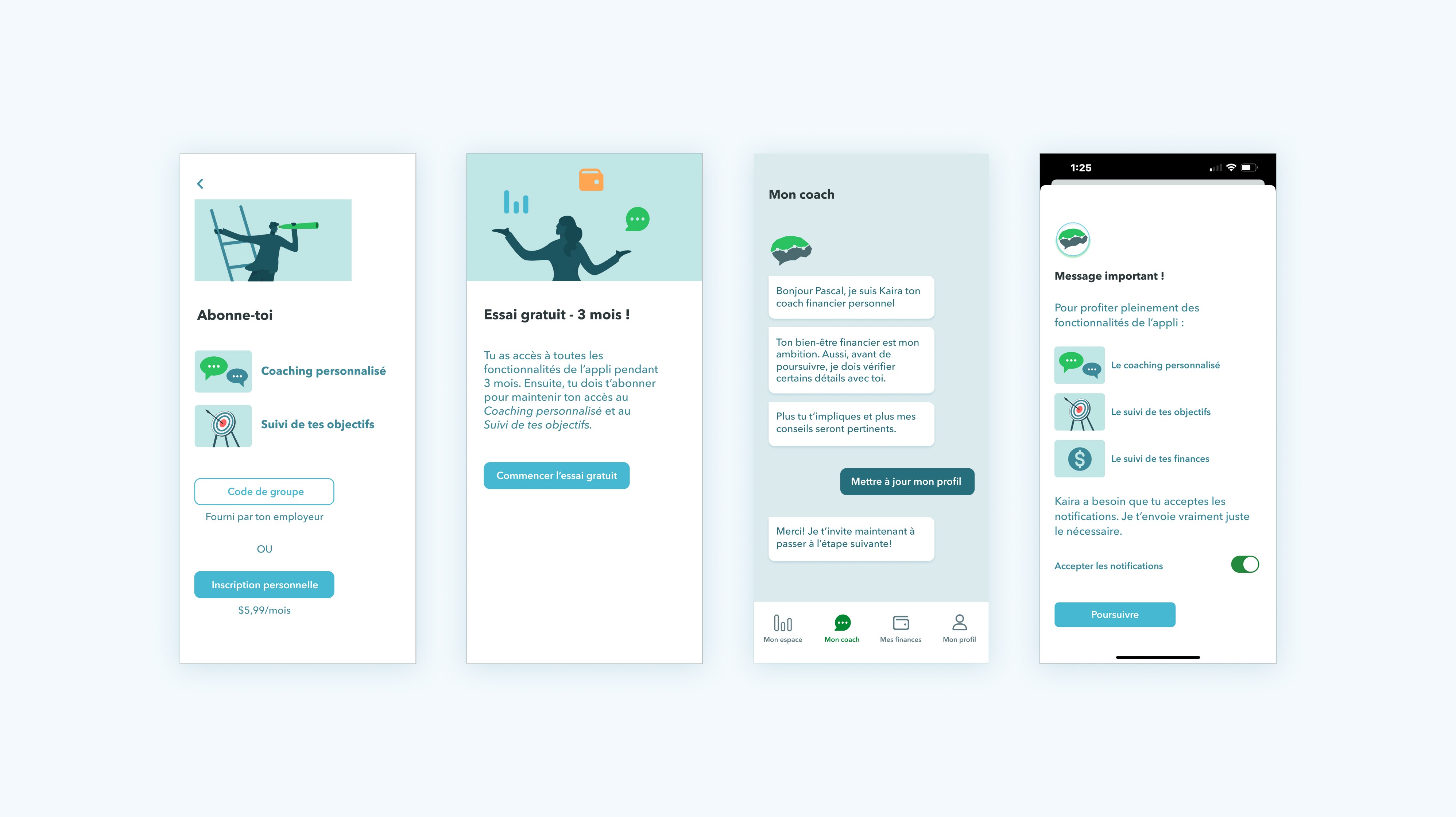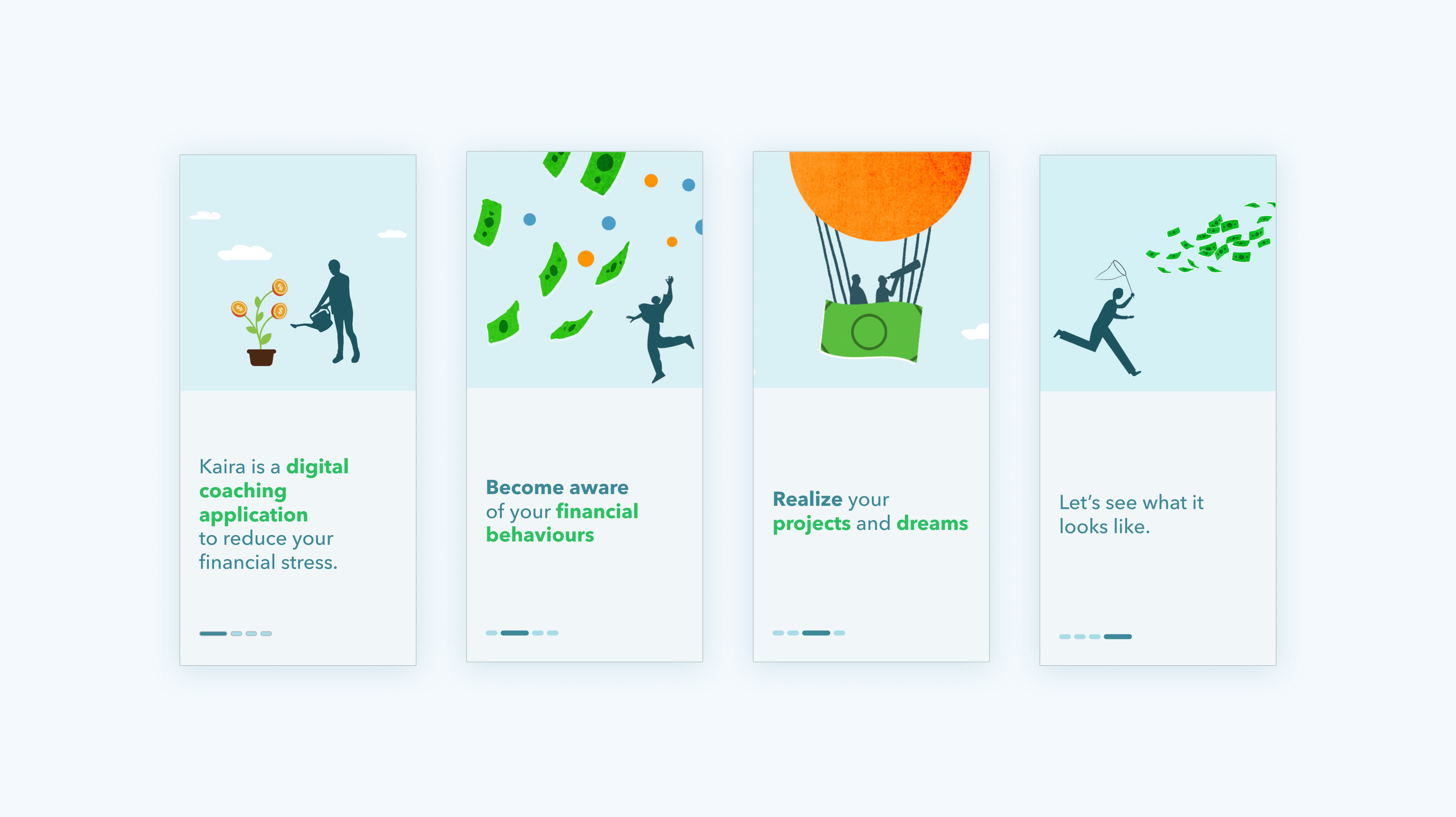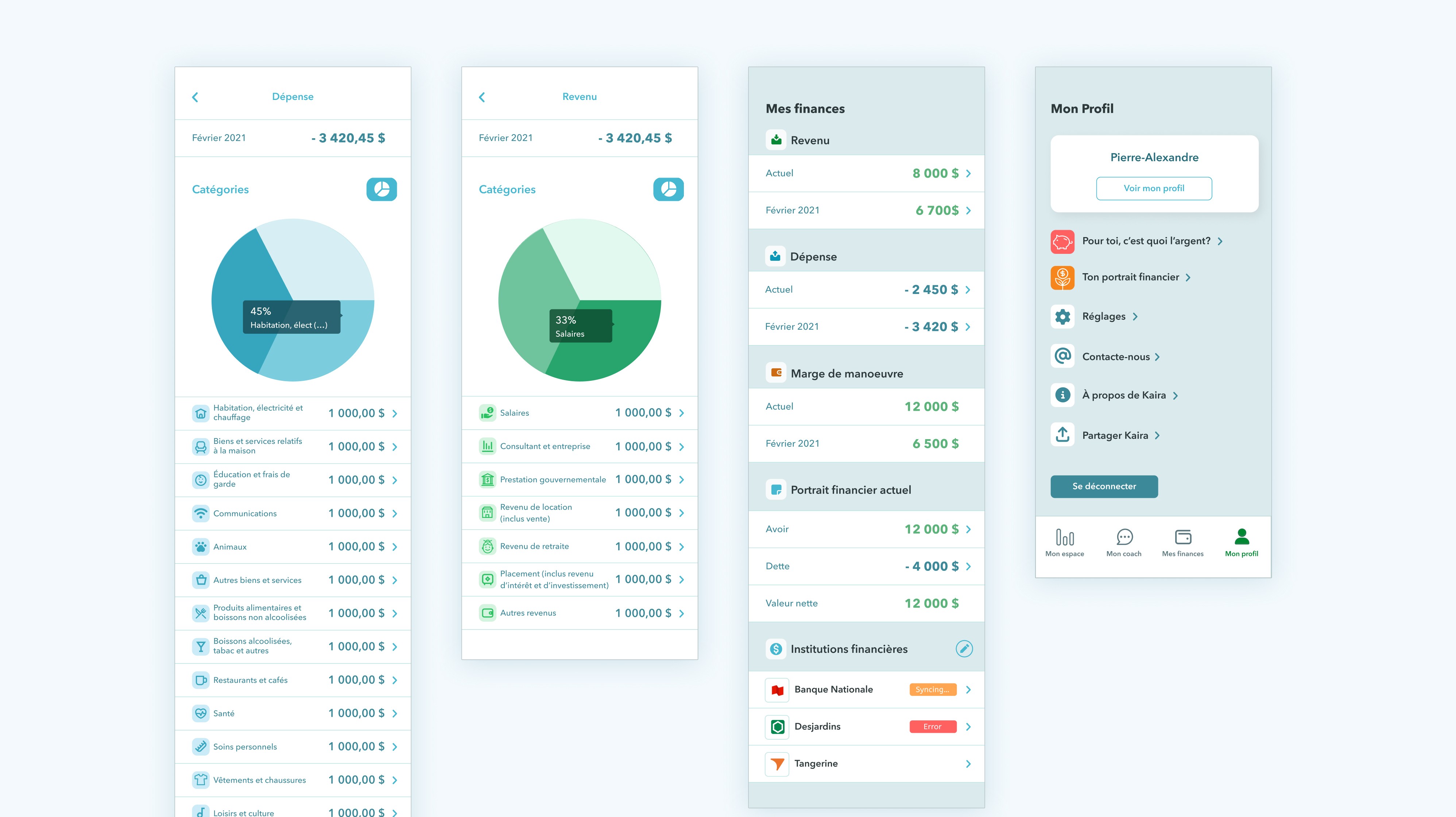 Kaira’s mission is to improve employee wellbeing at work through personalized digital coaching in financial wellness. I shaped the core UX and mobile UI, designing an experience that helps employees reduce financial stress while giving organizations access to anonymized wellbeing trends. The platform uses AI to interpret financial behaviours, generate tailored recommendations and surface insights that support both individual progress and organizational understanding.